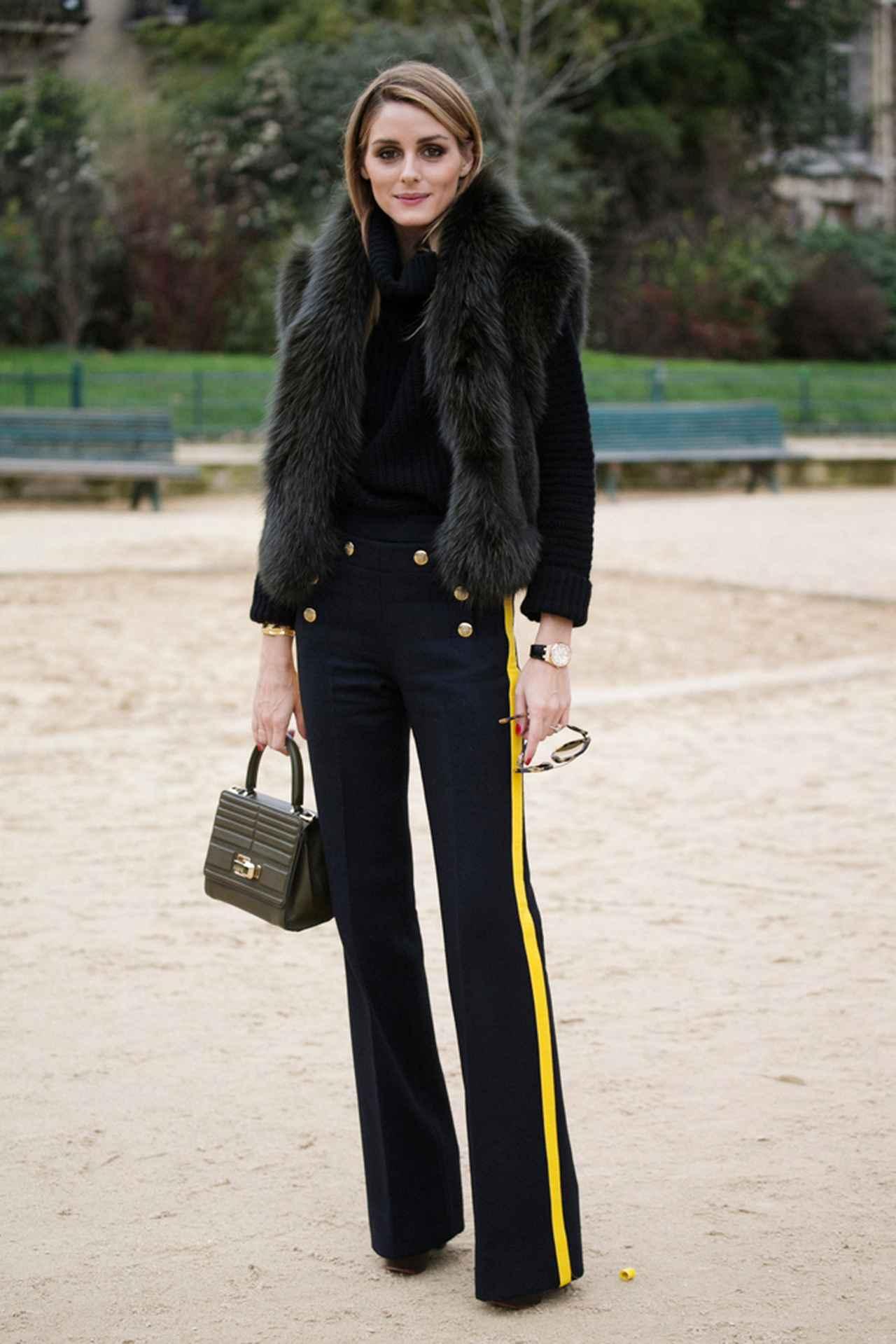 黄色のサイドラインが効いたマリン風パンツに、ネイビーのニットとファーベストを合わせて、見事にエレガントなパンツスタイルに昇華したオリヴィア。さらにヒールでスタイルアップを計って。