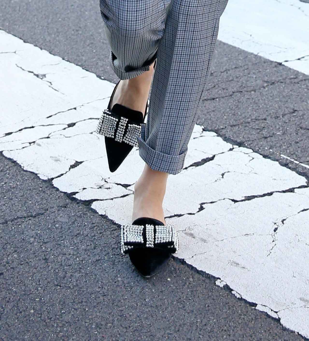 足元は大きなシルバーのリボンがついたポインテッドトゥでシックかつガーリーに仕上げて。