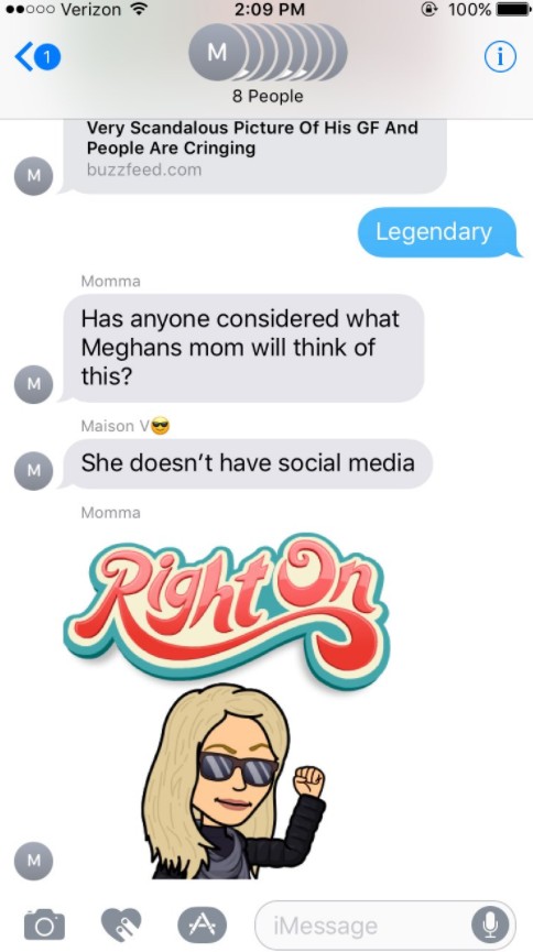 メイソンは仕方なく母親にこの写真が拡散されている理由を話すことに。するとメイソンの母親は、「メーガンのお母さんがどう思うか誰も考えてないの?」と返答。メイソンが、「メーガンのお母さんはソーシャルメディアのアカウント持ってないよ」と答えると、「よかったね!」と書いてファンキーなスタンプを送った。