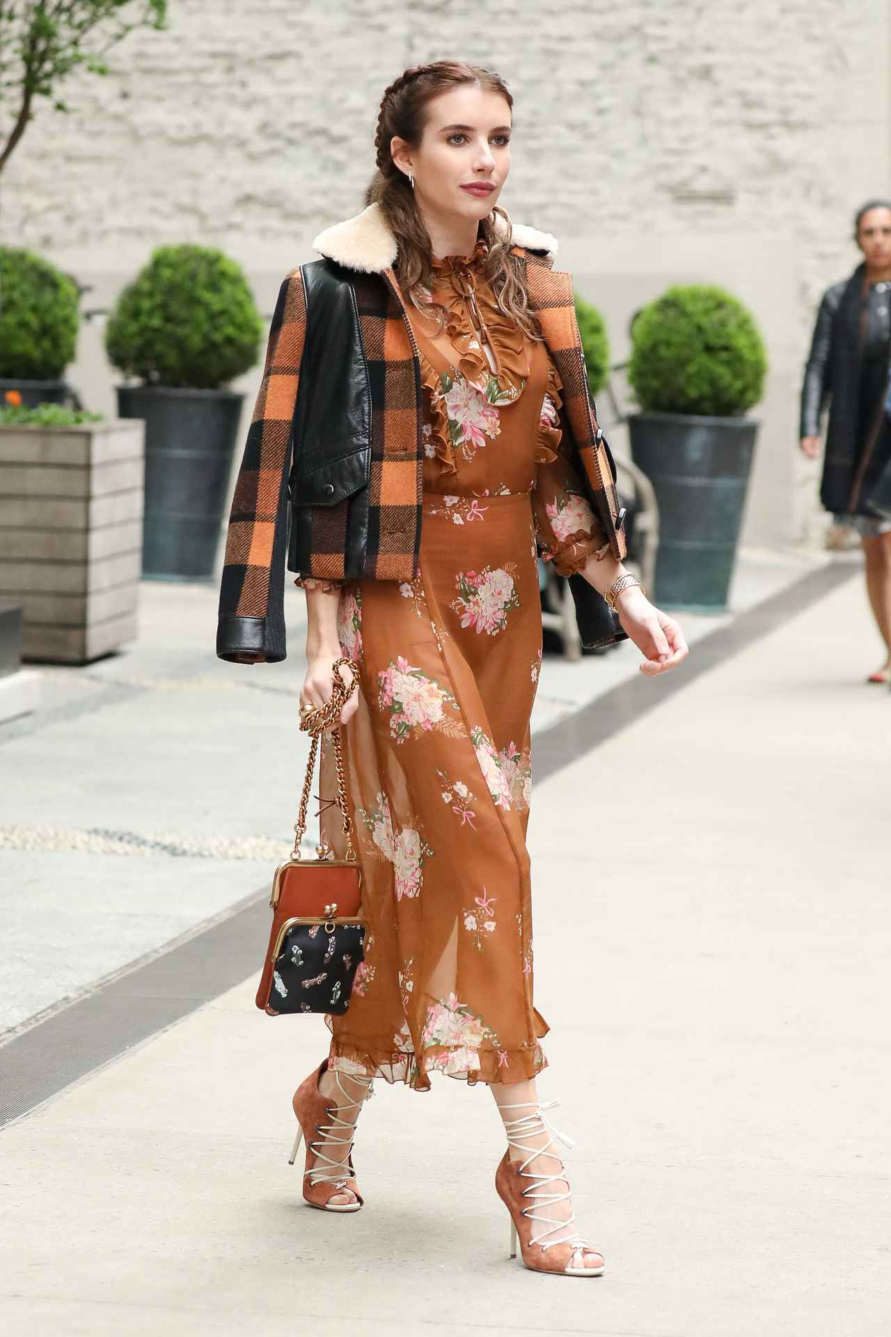胸元のラッフルと全体に描かれた花柄がロマンチックなシースルードレスは、チェック柄のカジュアルなムートンコートでバランスを取って。がま口のバッグが2つ重なった個性的なバッグのチェーンを手づかみしたのが◎。レースアップシューズはMALONE SOULIERS、それ以外はすべてCOACH。