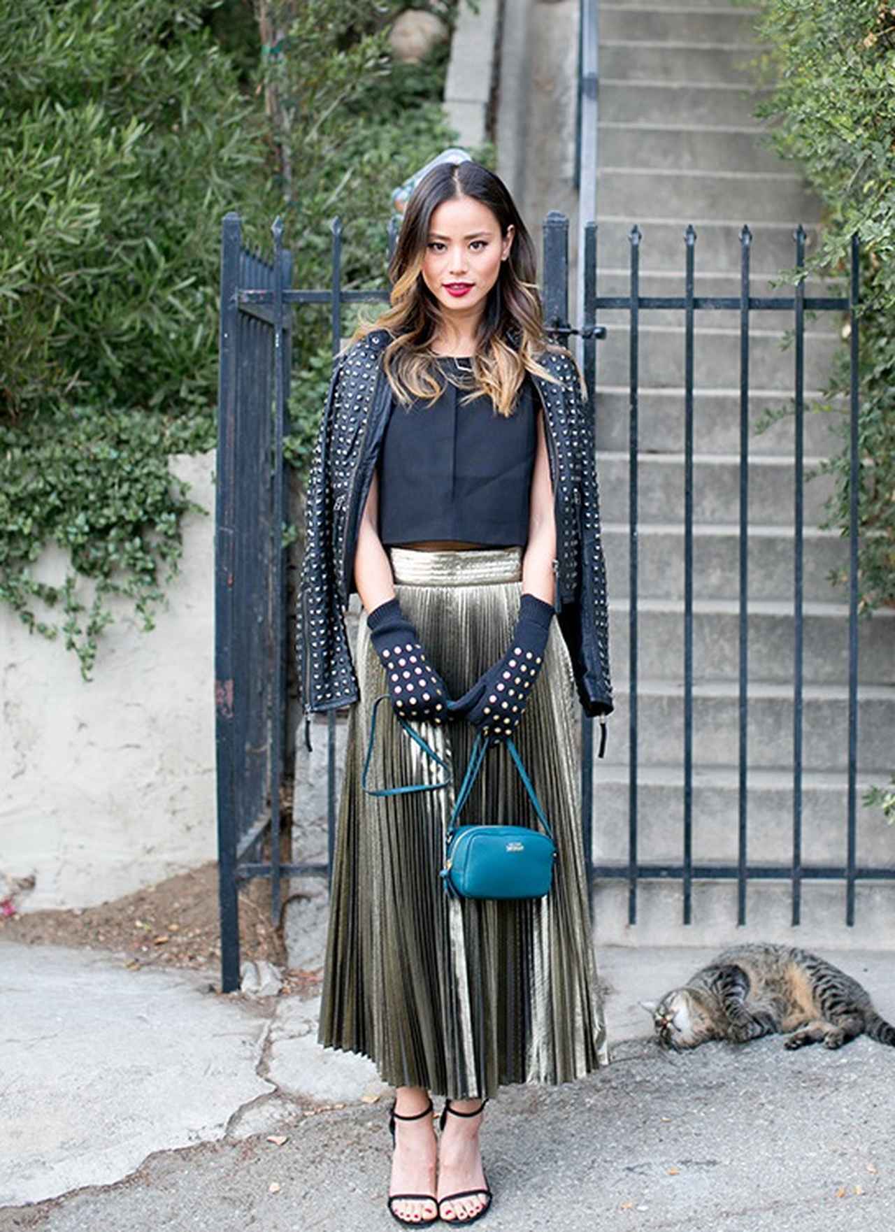 Kate spadeのメタリックスカートを主役に、スタッズ付きレザージャケットでエッジーなエッセンスを足し、そこにドット柄のグローブを投入してレトロな女優風に。華奢なヒールはSTUART WEITZMAN。