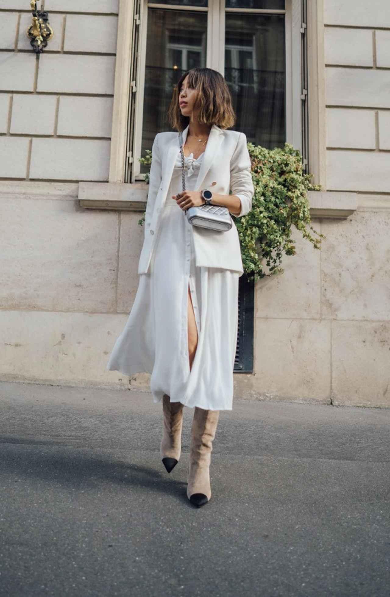 YUMI KIMの涼し気なフロントボタンドレスに、MANGOのホワイトジャケットを羽織り洗練された大人のホワイトスタイルに。そこにCHANELのスエードブーツとシルバーバッグで季節感をプラス。