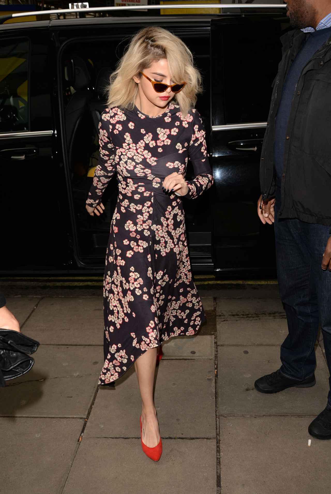 まずラジオ出演から始まったこの日は、大人な雰囲気を醸し出すISABEL MARANTの花柄アシンメトリーワンピースで登場したセレーナ。MANSUR GAVRIELのパンプスで足元にオレンジレッドを差し色し、レトロなKyturaのキャットアイサングラスでアクセントを添えて。