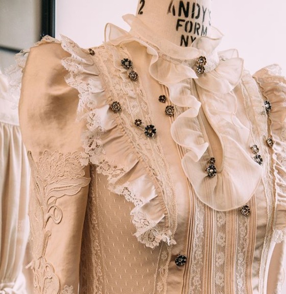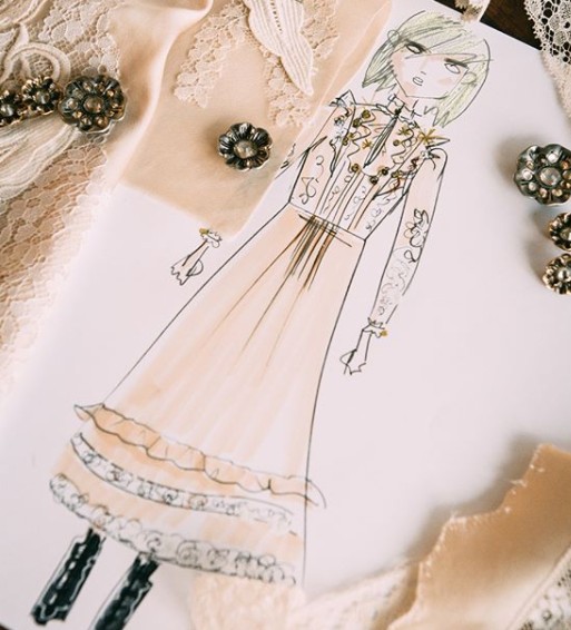 このドレスは、the Satin Prairie Dressと名付けられ、ハスの花の刺しゅう、ティーローズのアプリコット、ヴィクトリア調のフリルと細部までこだわったデザインとなっている。