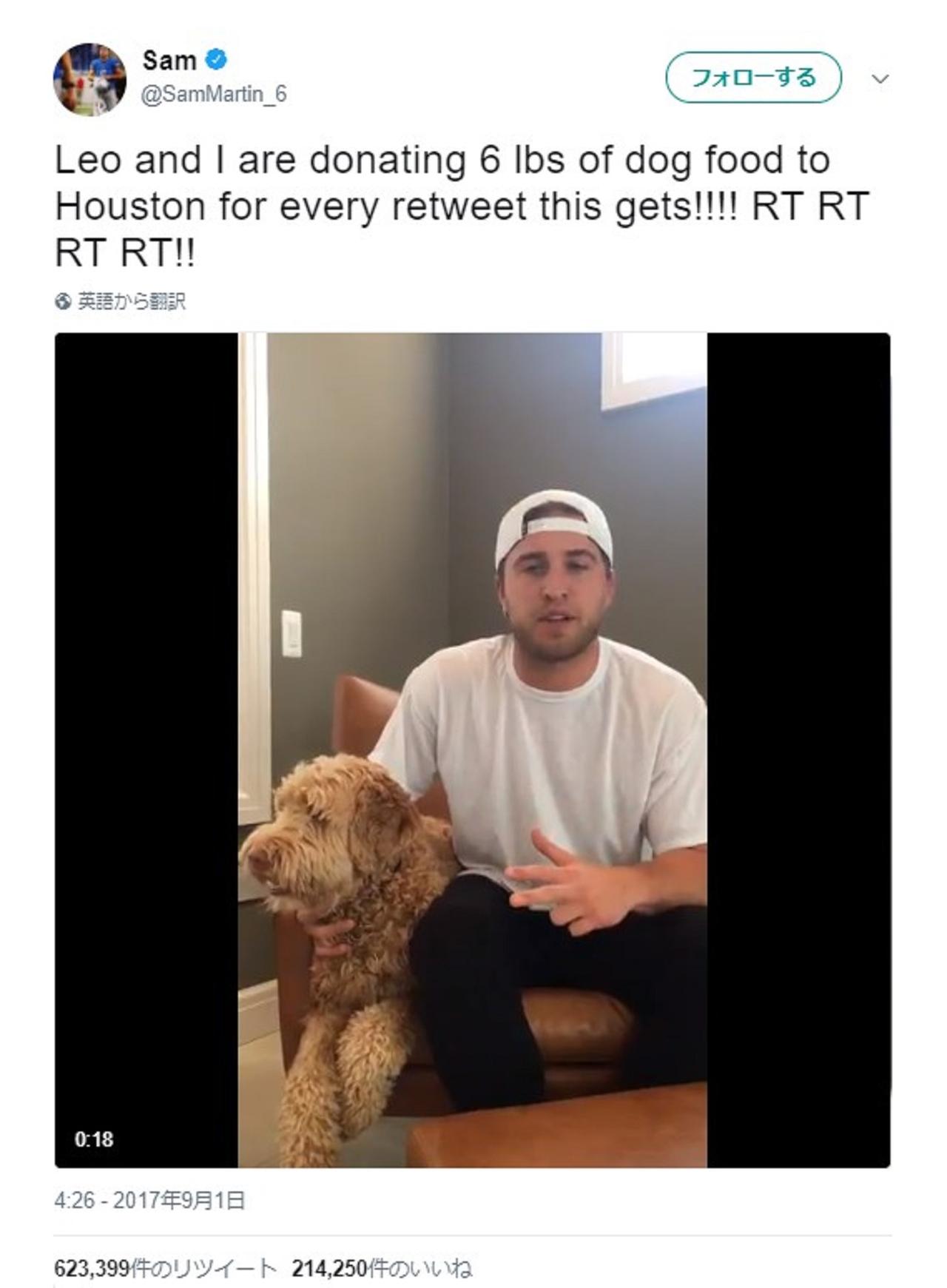 ハリケーン・ハービーで被災した犬たちへの支援を募るため「1ツイートあたり6パウンド(約2.7キロ)のドッグフードを寄付します」と愛犬とともに登場した動画が60万リツイート超え。
