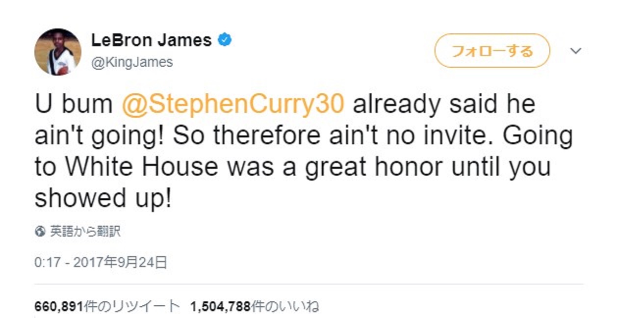 ドナルド・トランプ大統領が、NBA選手のステフィン・カリーのホワイトハウスへの招待を取り消したことを明らかにしたのに対し横やりを入れたジェームズ選手のツイートが話題に。「役立たずめ。カリーはもう(先にスケジュールの都合で)行かないって言っただろ! 招待なんてもう必要無いんだよ。ホワイトハウスへの訪問はあんたが出てくるまでは名誉なことだったのにな」と批判したことで反トランプ派に支持された。