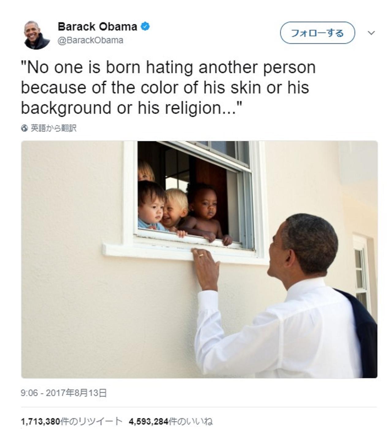 オバマ元大統領は、自身がさまざまな人種の子どもたちと触れ合う様子をおさめた1枚の写真とともに「生まれたときから肌の色や育ち、宗教の違いで他人を憎む人などいない」という言葉をシェアし、ヘイト・クライム(憎悪犯罪)の撲滅を訴えた。