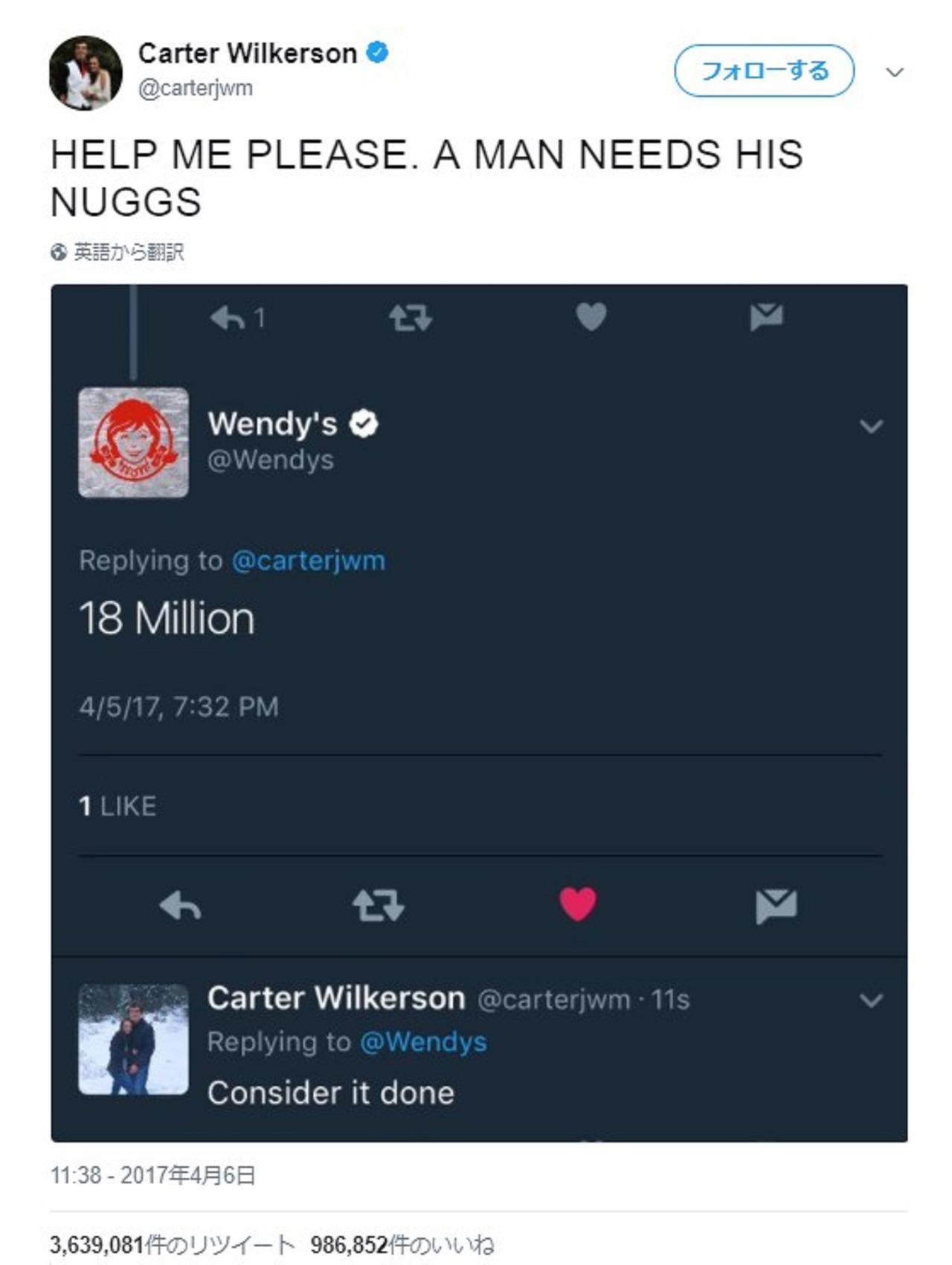 カーター・ウィルカーソンという男子高校生が、今年の4月、ファストフードチェーン店「ウェンディーズ」のアカウントに向けて「やあ、ウェンディーズ。どれだけのリツイート数があったら、1年間チキンナゲットをタダにしてくれる?」とツイート。