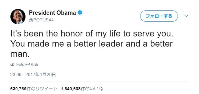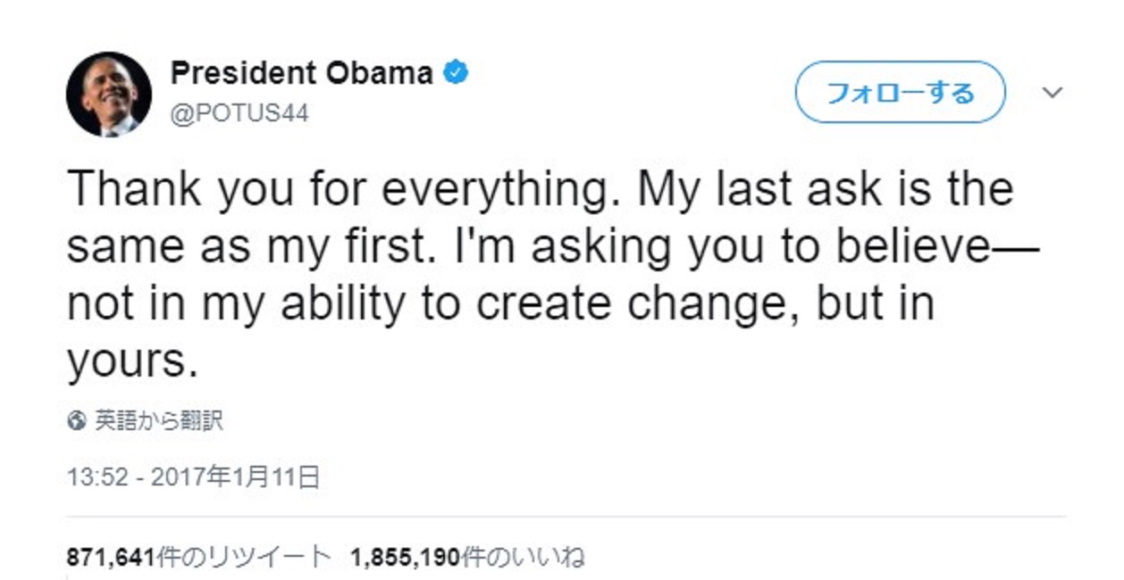 今年1月に米大統領の座を退いたオバマ元大統領の「すべてにおいて皆さんに感謝します。私の最後の願いは、最初の願いと同じです。私ではなく、あなた自身が秘めている変化を創造する力を信じてください」という感謝の想いを込めたツイート。