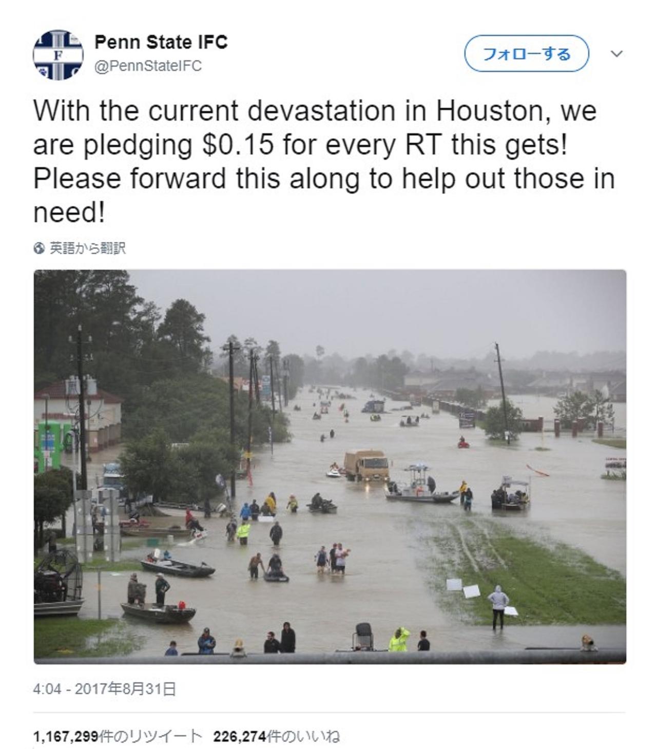 8月に発生し、甚大な被害を出した米テキサス州ヒューストンを襲ったハリケーン・ハービー被を受け、「リツイート1件につき15セントを支援する」としたペンシルベニア州立大学友愛会公式アカウントのツイート。