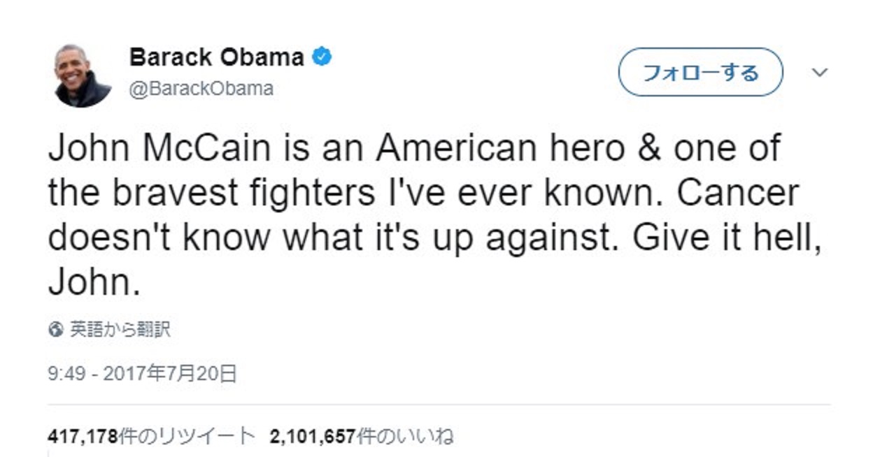 そして、3位となったのは、再びオバマ元大統領のツイート。悪性の脳腫瘍と診断されたことを明らかにした米共和党のジョン・マケイン上院議員に対して送った「ジョン・マケインはアメリカの英雄だ。私が知っているなかで、もっとも勇敢なファイターでもある。がんの奴、自分がどんな人間を相手にしているのか分かっていないのさ。がんを酷い目にあわせてやれよ、ジョン」という、男の友情を感じるエールのが人々の心に響き、約210万件の「いいね」を集めている。