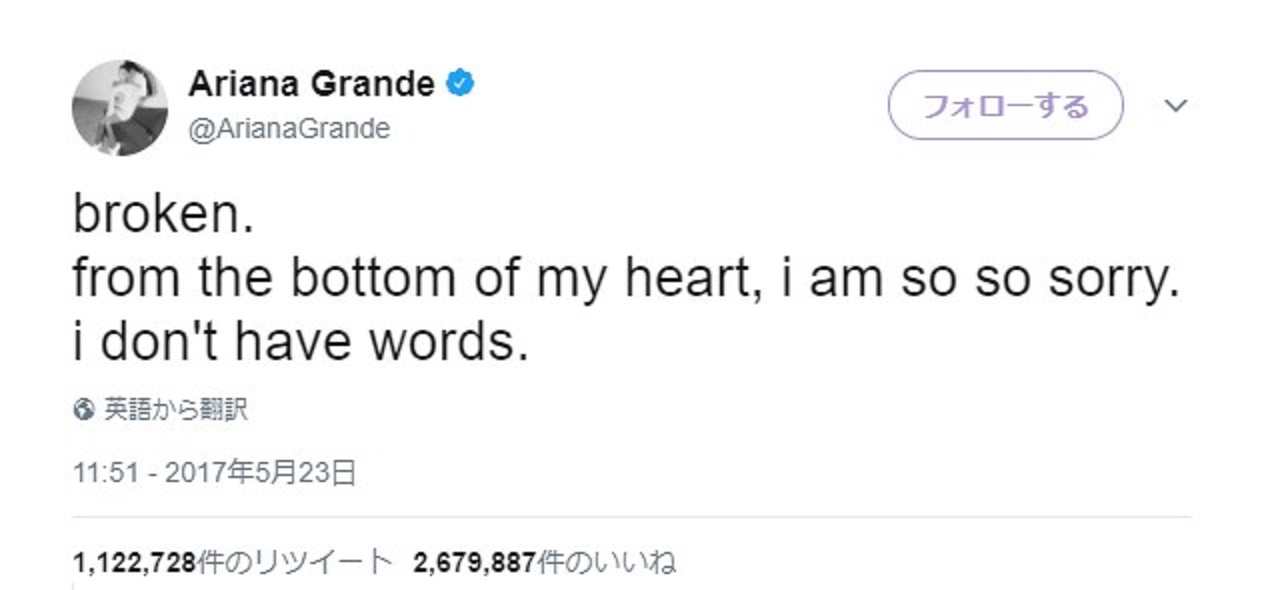 あまりの衝撃にショックで言葉少なに悲しみを伝えた「打ちのめされています。心の底から、本当に本当に申し訳ないと思っています。言葉もありません」というアリアナのツイートには約268万件の「いいね」が寄せられている。