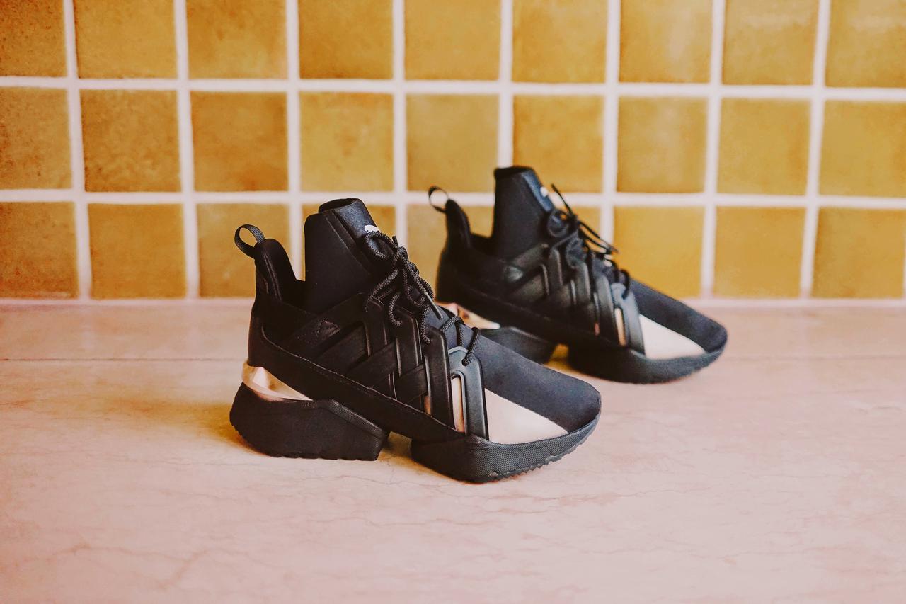 同ブランドの新作スニーカー「プーマ ミューズ エコー」は、マーシャルアーツとバレエからインスピレーションを得ており、分割されたアウトソールが特徴で、シックなデザインにメタリックのアクセントが施されている。