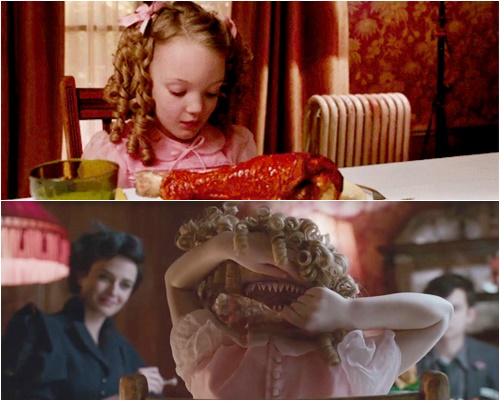 ミス・ペレグリンのもとに集まる”奇妙な”能力を持った子供たちのなかのひとり、クレア・デンスモア。幼い彼女はクルクルのブロンドヘアの後頭部にもう一つの口を持っているけれど、これは、日本の妖怪「二口女(ふたくちおんな)」にインスパイアされたと言われている。