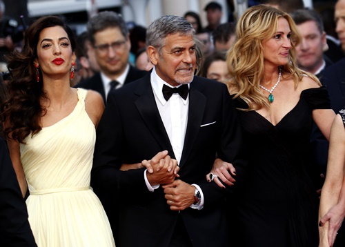 カンヌ国際映画祭にて、ジョージが妻アマル(左)と友人ジュリア(右)をエスコート。