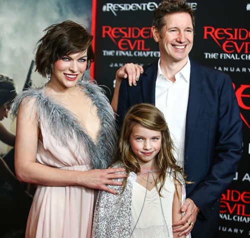 ミラ、アンダーソン監督、そして娘のエヴァーちゃんが、映画のLAプレミアにて。