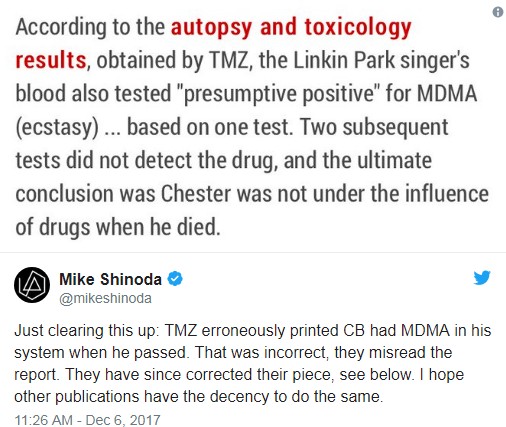 マイクは自身のツイッター上で、「はっきりさせておくよ、チェスターが亡くなったときMDMAが体内にあったとTMZが間違った報道をしていた。これは間違いで、彼らはレポートを読み間違えたんだ。彼らはすでにその部分を修正している。ほかのメディアも同じように良識を持ってくれることを願うよ」と、TMZの記事を貼り付けてコメント。