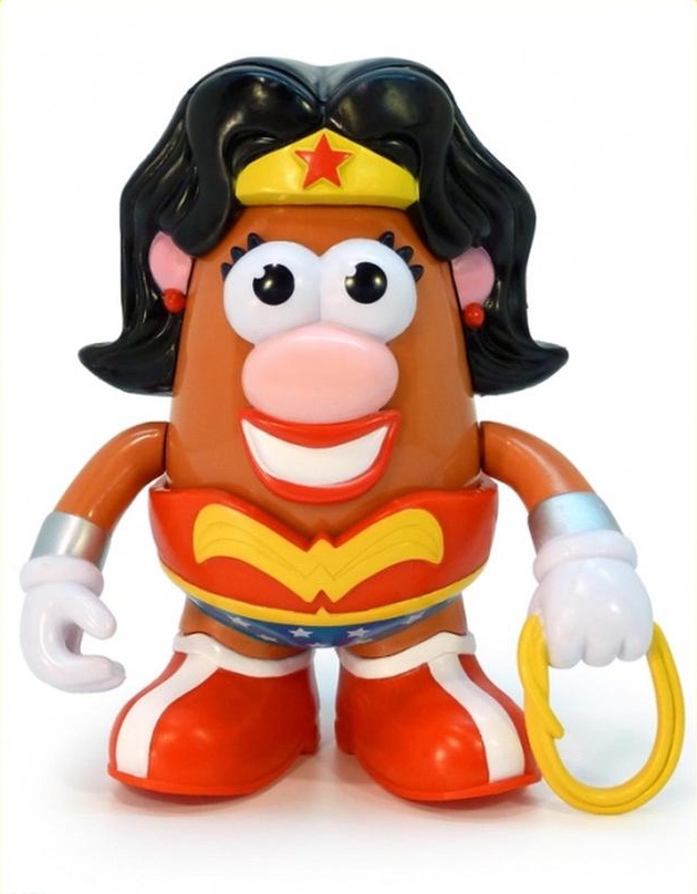 ワンダーウーマンに変身したミセス・ポテトヘッドのフィギュアは、顔や体のパーツを付け替えることができ、組み替えたりして楽しむことができる。