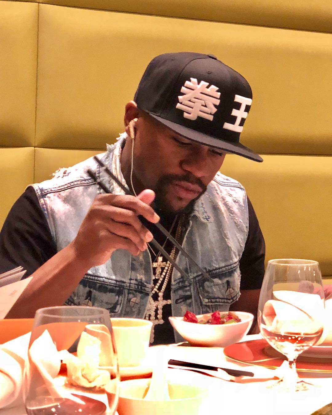 しかし注目するのは、メイウェザーの箸使いのうまさではなく、彼の帽子。そこには50戦全勝しているメイウェザーらしく「拳王」という文字が大きく輝いていた。