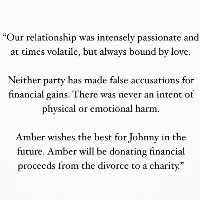 アンバーはジョニーの将来の幸せを祈るとともに、この離婚で得る経済的利益をチャリティに寄付します」