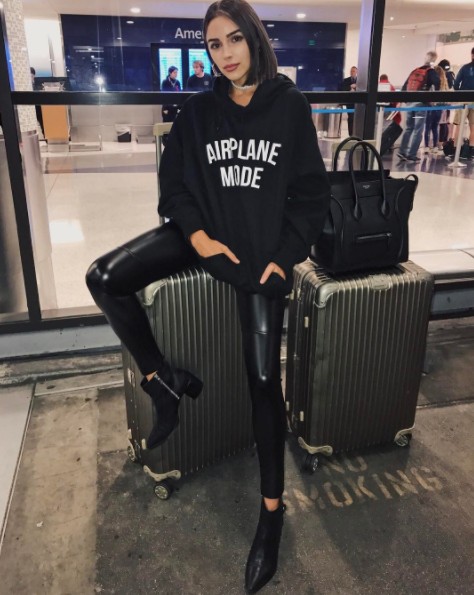 スーツケースに腰かけてポーズを取るオリヴィアは、「AIRPLAINE MODE(飛行機モード)」と書かれた遊び心たっぷりのメッセージ入りスウェットに、レザーのレギンスをセットし、上下のバランスを計算して。