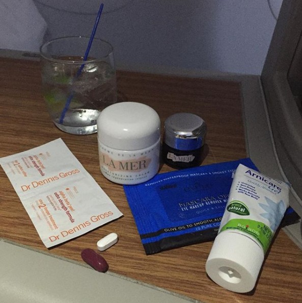 私の肌は信じられないぐらい乾燥してるから、機内には必ずアルガンオイルを持っていくの。これをつけないと肌が固まっちゃうぐらい乾燥するから、とにかくたくさんつけるわ