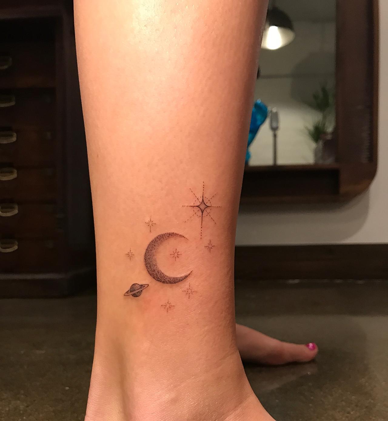 三日月や惑星など宇宙をイメージしたこのタトゥー、実は母キャリーの右足にも同じようなタトゥーが入っていた。