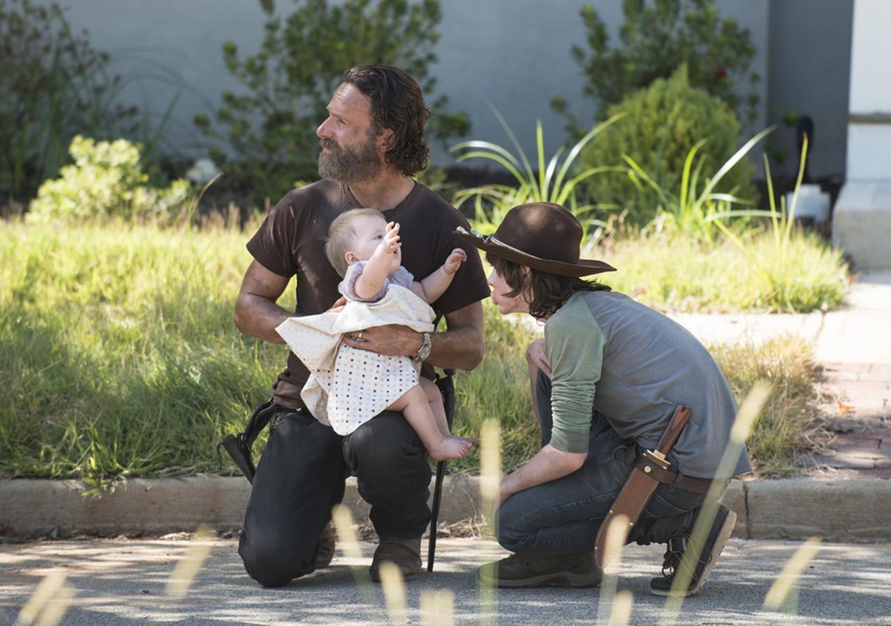 リックの娘ジュディスを休憩中にあやすのは、ジュディスの兄でリックの息子カールを演じるチャンドラー・リッグス。
