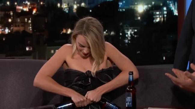 女優のマーゴット・ロビーが、栓抜きを使わずに小ぶりなビール瓶のフタを開ける裏ワザを披露!