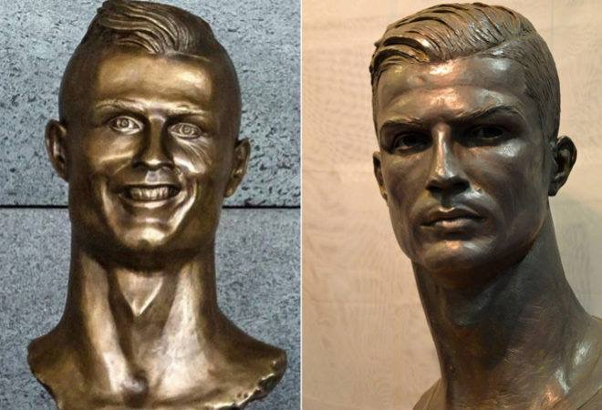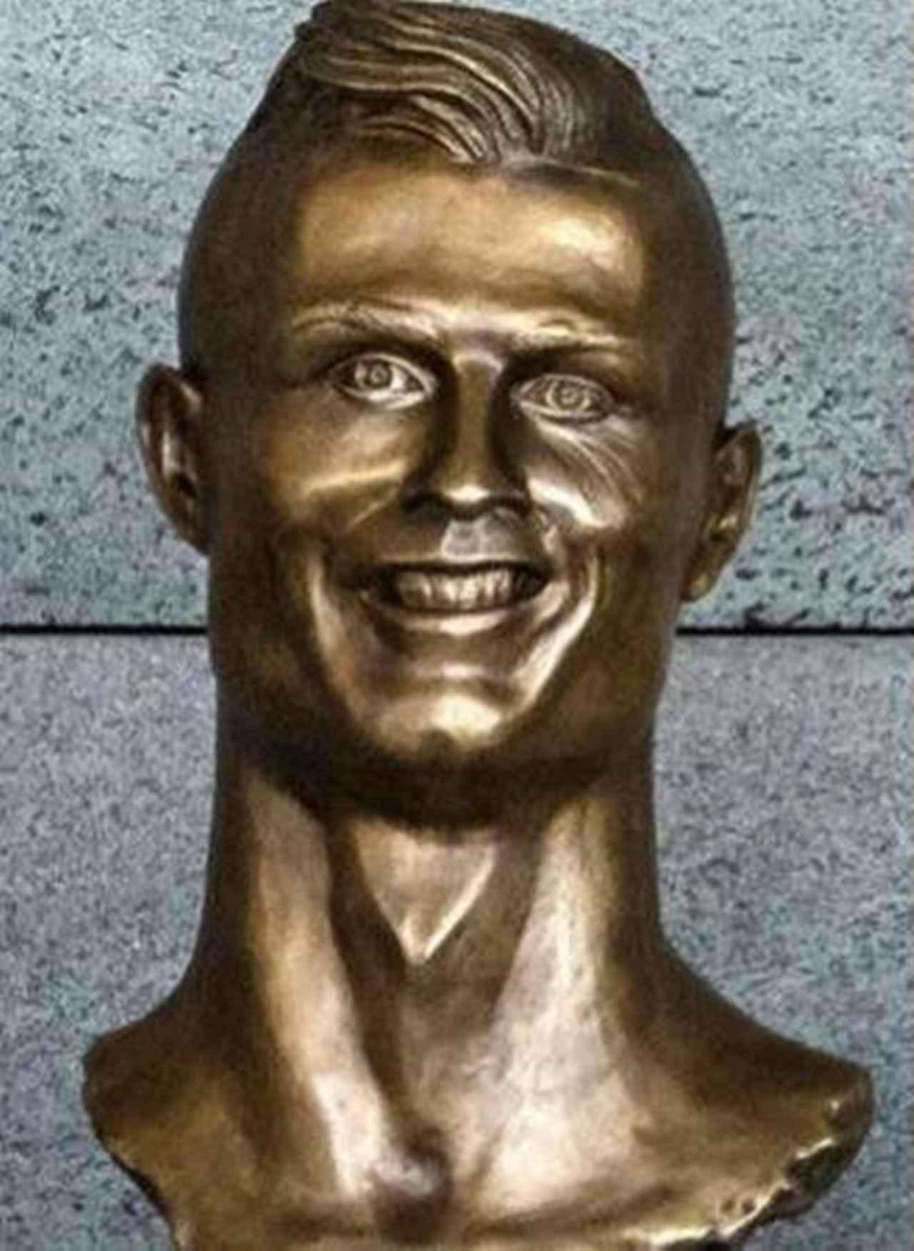 この銅像は、ロナウドの故郷マデイラ島の空港に設置され、公開されるとすぐに、あまりの似てなさぶりに大きな話題となったもの。