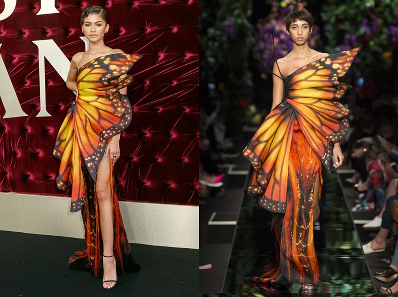 小雨が降るなか駆けつけた観客たちに笑顔で手を振りながらレッドカーペットに登場したゼンデイヤが身に着けていたのは、オレンジ色の巨大な蝶をモチーフにしたドレス。