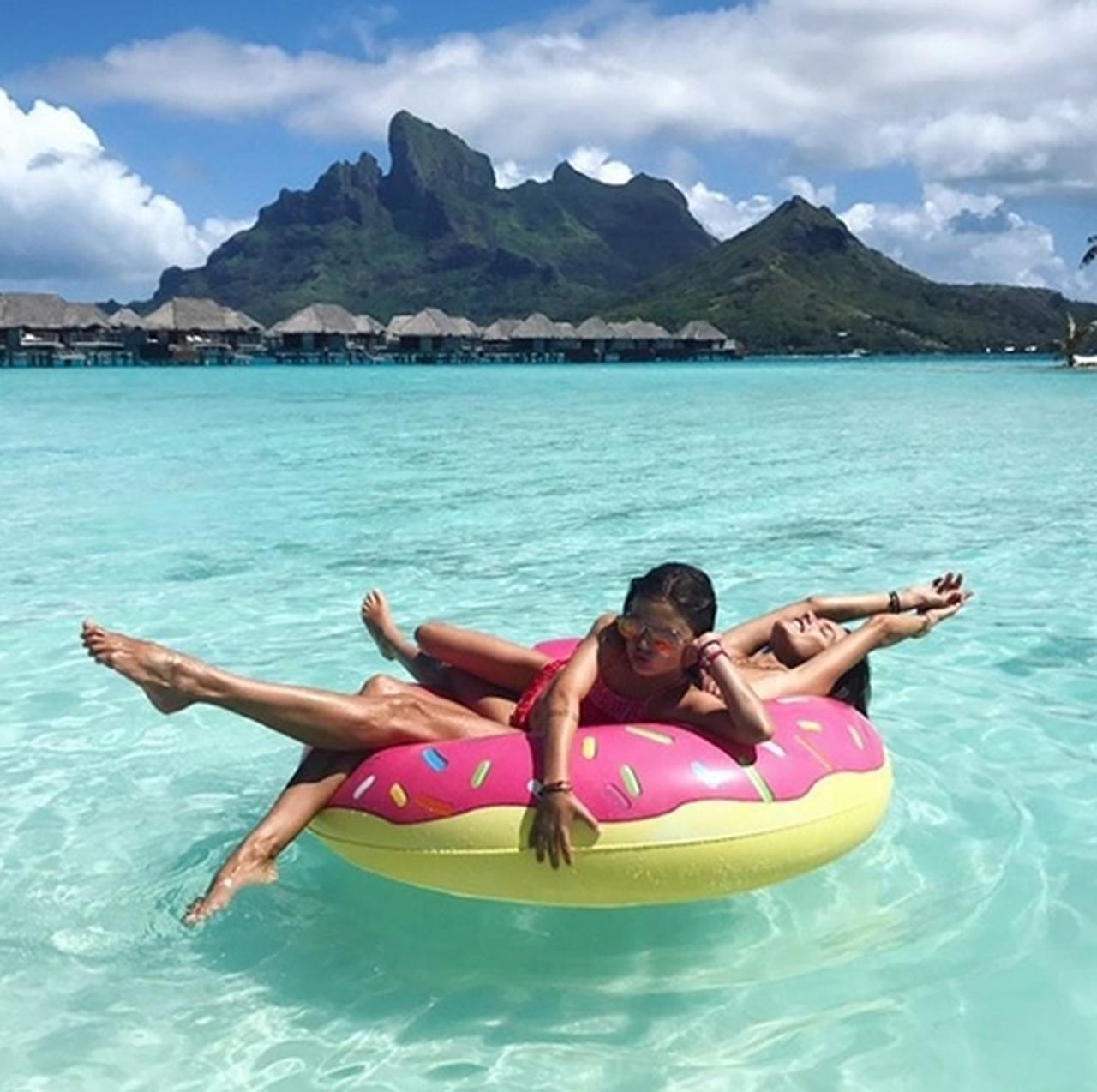 旅行で訪れたタヒチのボラボラ島では、娘アンジャちゃんとおそろいのヨガポーズで記念撮影。