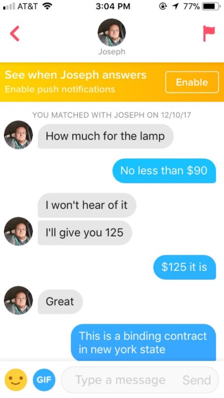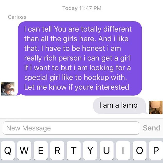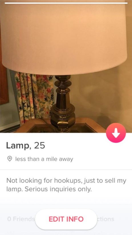なんとその方法とは、Tinderでランプを売ること。なんとアリーンは、もういらなくなったランプの写真をプロフィール写真に設定し、プロフィール欄にも、「体目的は求めてない、私のランプを売る目的だけよ。真面目な質問のみ受け付けます」と書いた。