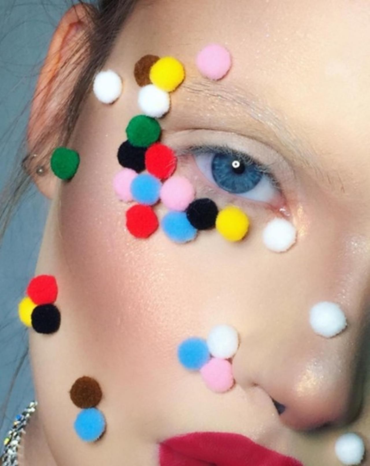 芸術作品ではないかと疑ってしまうほど完成度の高い「ポンポンメイク」は、カラフルなポンポンをつけまつ毛ののりなどでつけるだけで、あっという間にインスタ映え抜群のおしゃれフェイスに。