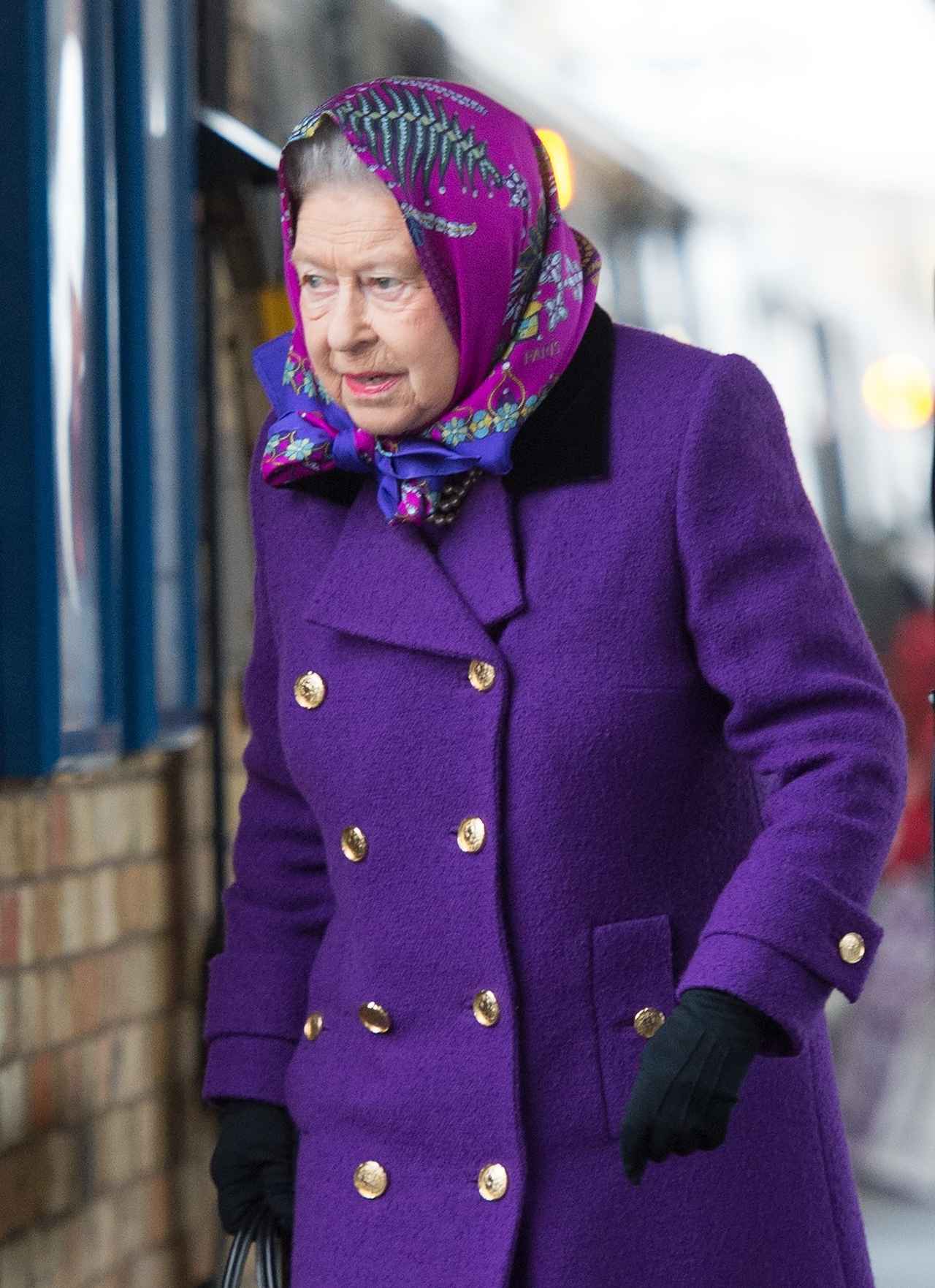 普段はよくハットを身に着けている女王だけれど、この日は鮮やかなパープルのコートに合わせたスカーフを着用。ちょっぴりリラックスした休暇仕様の着こなしとなった。