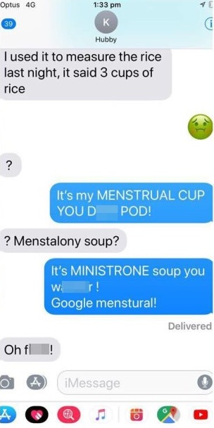 これに対しシンディが困った顔文字を送るも、「?」と反応し状況が分かっていない夫。妻は「これは私の月経カップよ、このバカ!」と激怒。しかし夫からすると「月経カップ(Menstrual Cup)」という意味すら分かっていない様子。