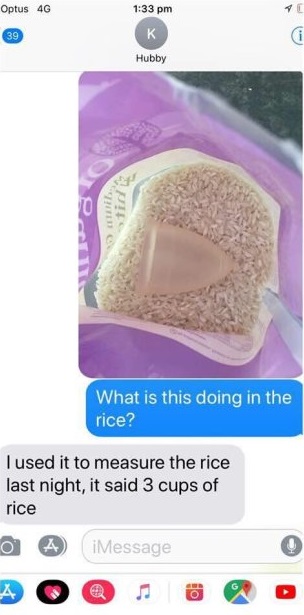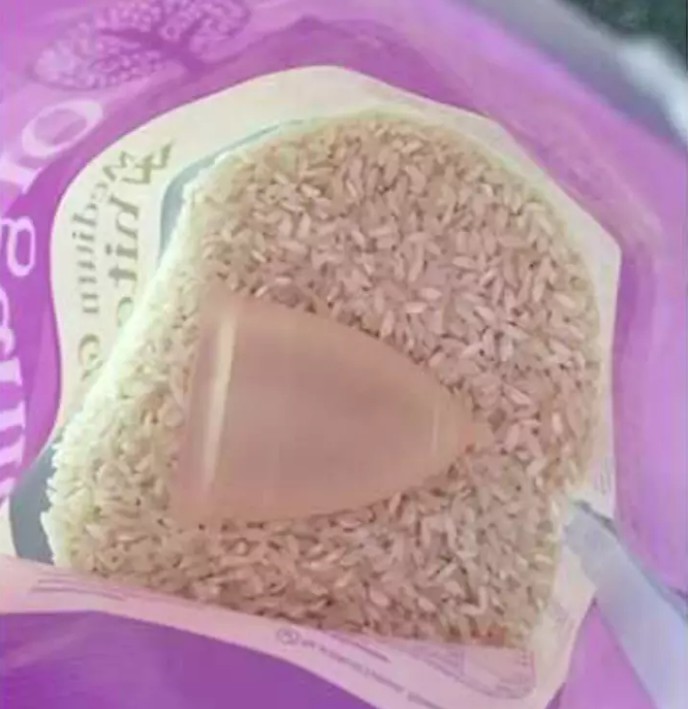 お米の計量カップが入っているように見えるけれど、じつはこれ月経カップという生理用品。これを純粋にお米の計量カップと思った夫はこれを使用してしまった。