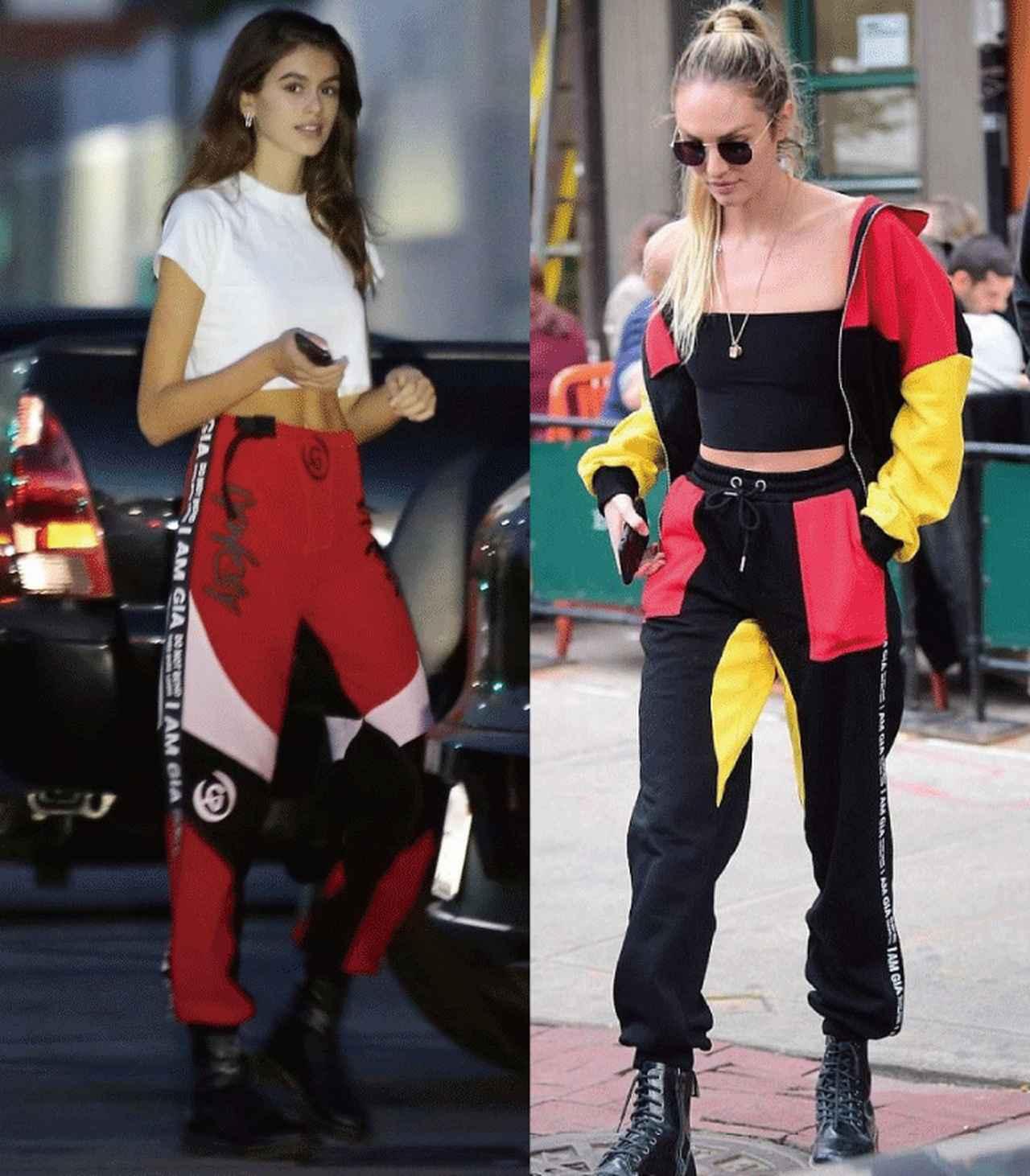 プレイフルなアスレジャースタイルを完成させる、カラフルなパンツがモデルたちに人気! 今年のITモデル、カイア・バーガー(左)と人気ヴィクシーモデルのキャンディス・スワネポール(右)は、サイドの縦ラインにI.AM.GIAのロゴが入ったパンツをブーツINしてクールに着こなして。