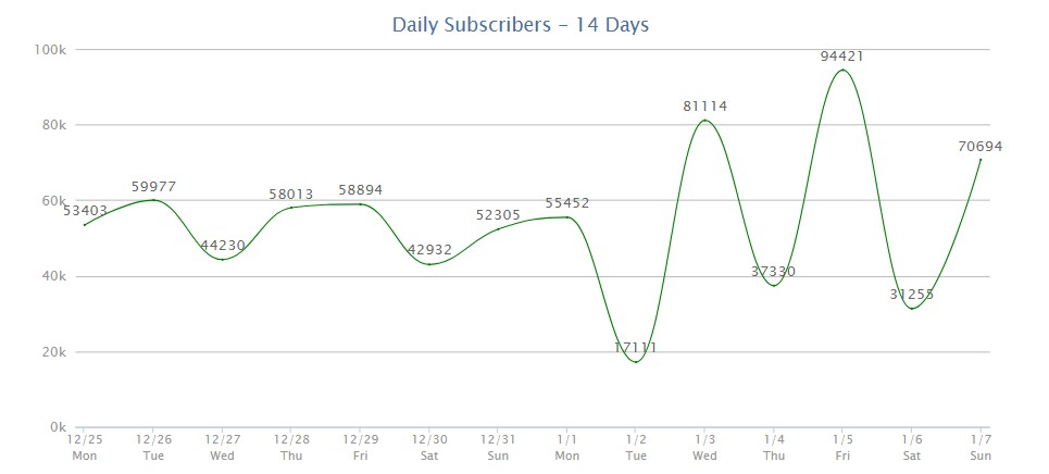 2017年12月25日から2018年1月7日までのローガンのYoutubeチャンネルの新規登録者数を示したグラフ。問題の動画が公開されたのは12月31日。©VidstatsX