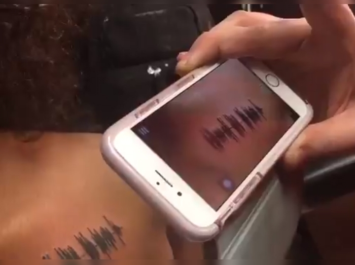 彼女が利用したのはアメリカの「スキン・モーション(Skin Motion)」という会社が発明した、サウンドウェーブ・タトゥー。「音」を表す波形、通称サウンドウェーブの形をしたタトゥーをスマートフォンの専用アプリで読み取ることで音が流れる、実に画期的な新感覚のタトゥーだ。
