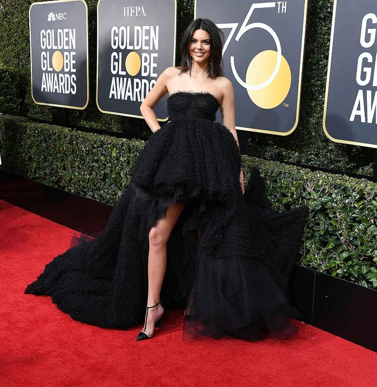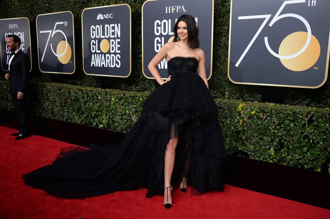 ほかの女性参加者たちと同じく、セクハラや性差別に抗議する目的で黒いドレスを身に纏って第75回ゴールデン・グローブ賞に現れたモデルのケンダル・ジェンナー。
