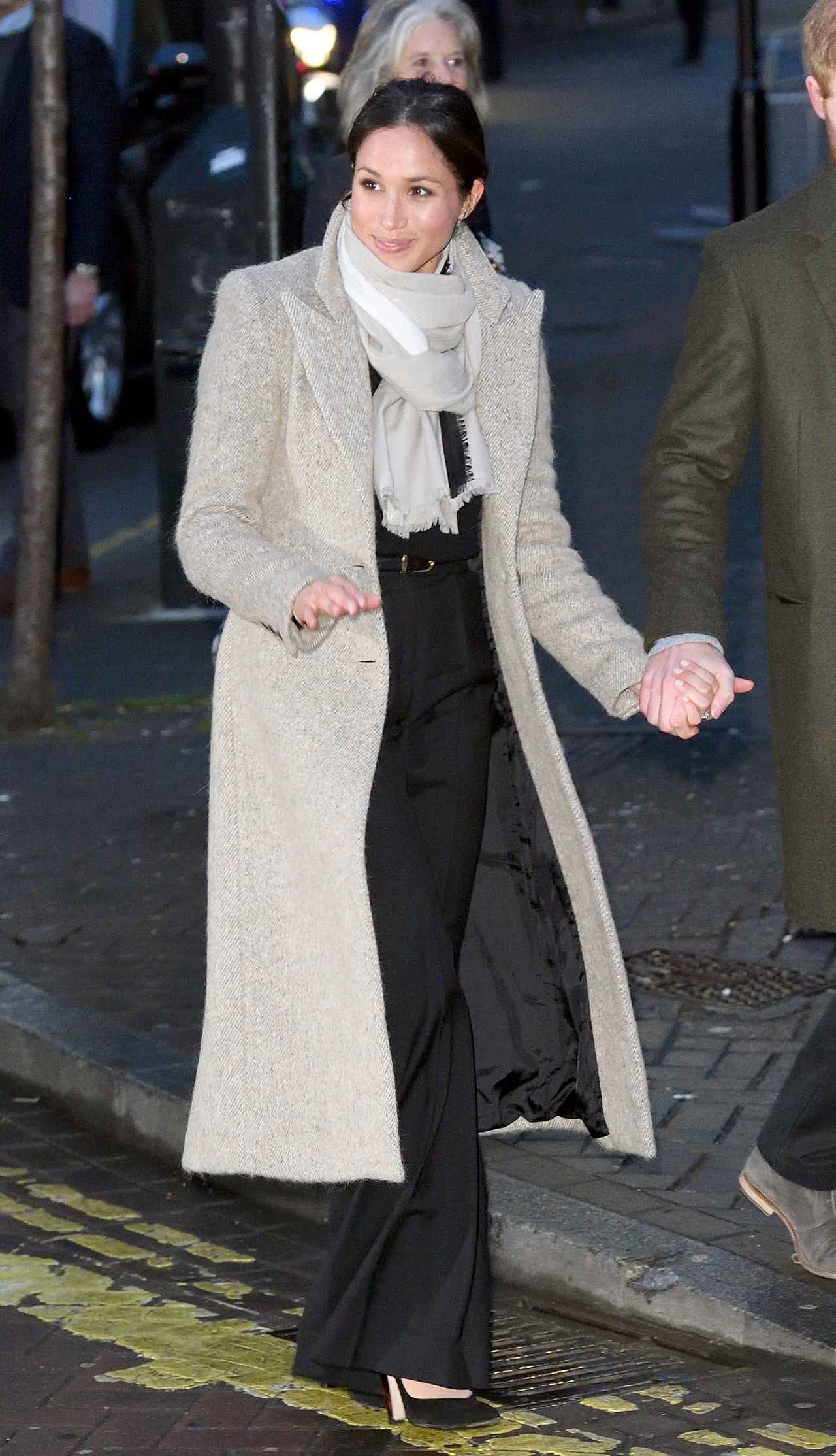 メーガンのこの日のファッションが「王室の人間らしくない」と言われてしまった理由は、コートの中に着ているニット、パンツ、パンプス、そしてベルトの色がすべて黒だったため。