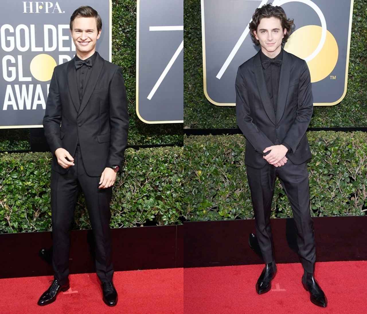 映画『ベイビー・ドライバー』でゴールデン・グローブ賞のミュージカル/コメディ部門の男優賞にノミネートしたアンセル・エルゴートと、映画『君の名前で僕を読んで』で同アワードのドラマ部門の男優賞にノミネートしたティモシー・シャラメ。