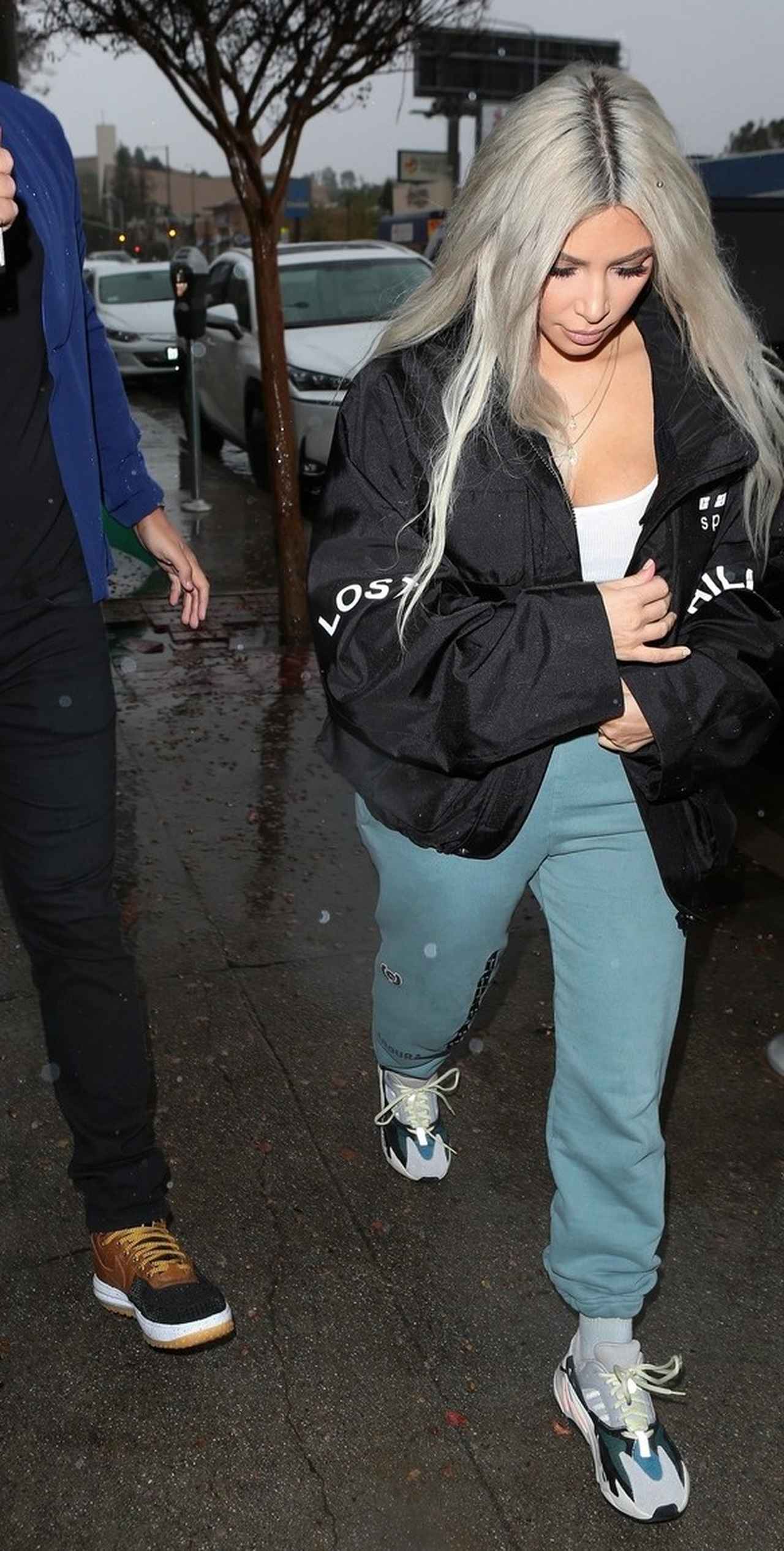adidas YEEZYのアイテムを誰よりも早く取り入れるのは、もちろんカニエの愛する妻であり、ファッショニスタとしても人気のキム! ジャケット、パンツ、スニーカー共にadidas YEEZYのもの。