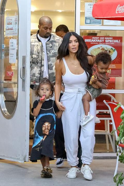 また別の日、カニエと子供2人を連れてファミリータイムを楽しむキムは、adidas YEEZYのパンツとAdidas Yeezy Powerphase Calabasasのスニーカーでスタイリングしたオールホワイト・コーデを披露。ちなみに息子のセイント君もスニーカーはYeezyを。