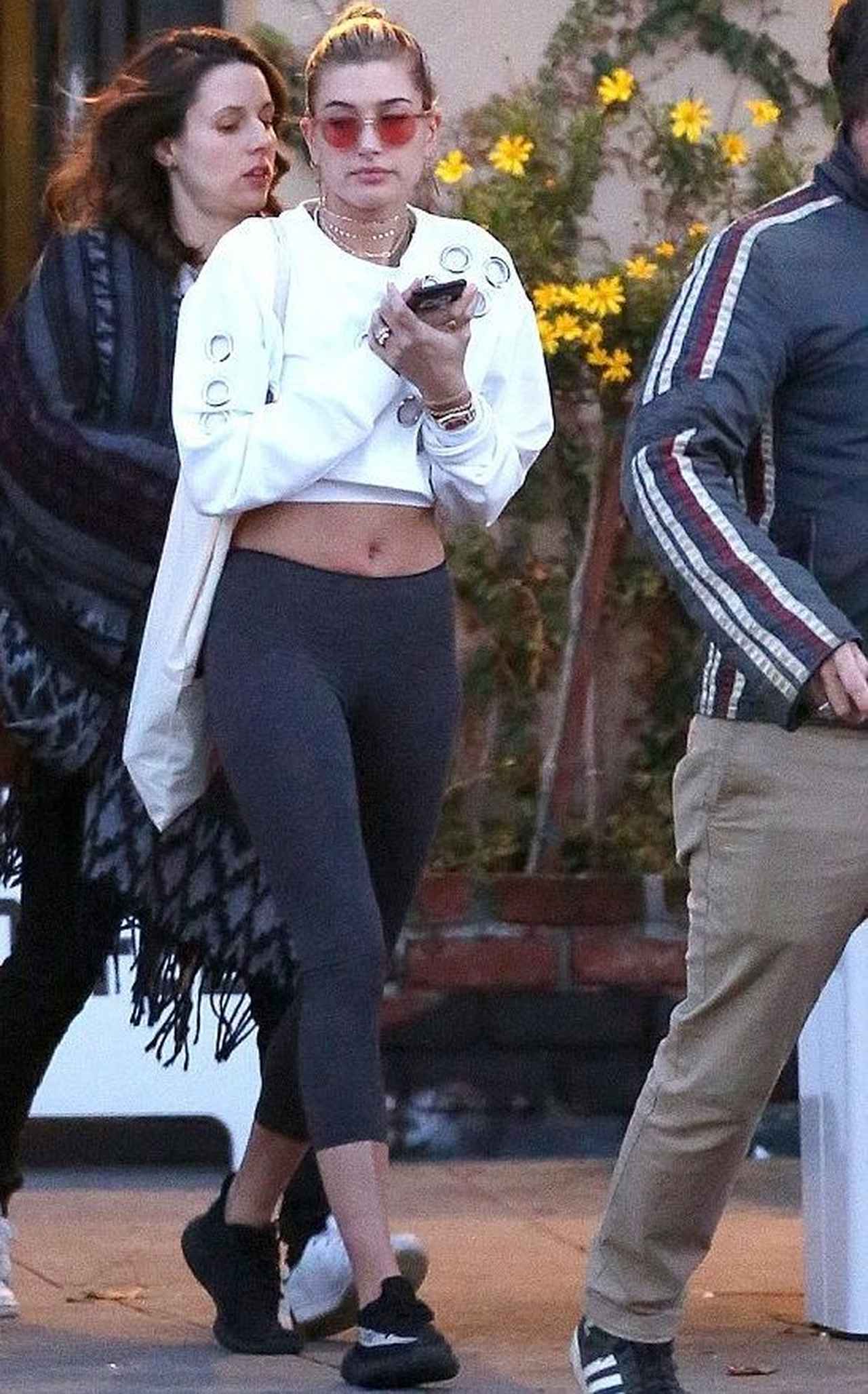 ストリートライクなカジュアルスタイルが得意なヘイリーは、クロップト丈のスウェットとレギンスのアスレジャーなスタイルに、Adidas Yeezy Boost 350 V2 のスニーカーをセット。こちらも世界各地で即完を記録したスニーカー!