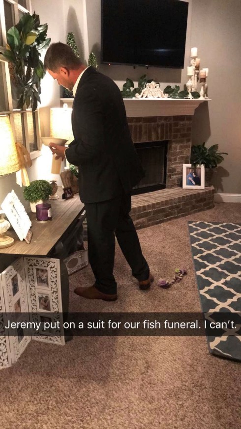 ジェレミーの妹であるジェイミーは、兄の妻から送られてきた写真をツイッターに公開し、「義理の姉から、お兄ちゃんが魚のお葬式を行っている写真が送られてきたの。今私は涙を流しているわ」とコメントをつけた。