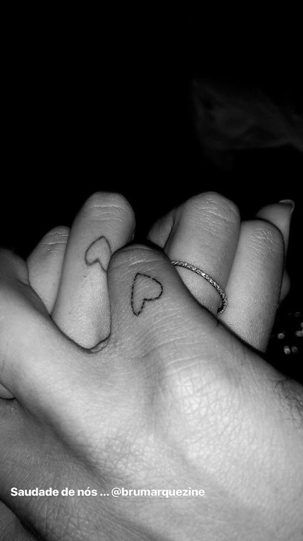 ネイマールが自身のインスタグラムストーリーに「君が恋しいよ」とキャプションをつけて投稿した写真には、ブルーナとネイマールが手を繋いでおり、お互いの指にシンプルなハートのタトゥーが。
