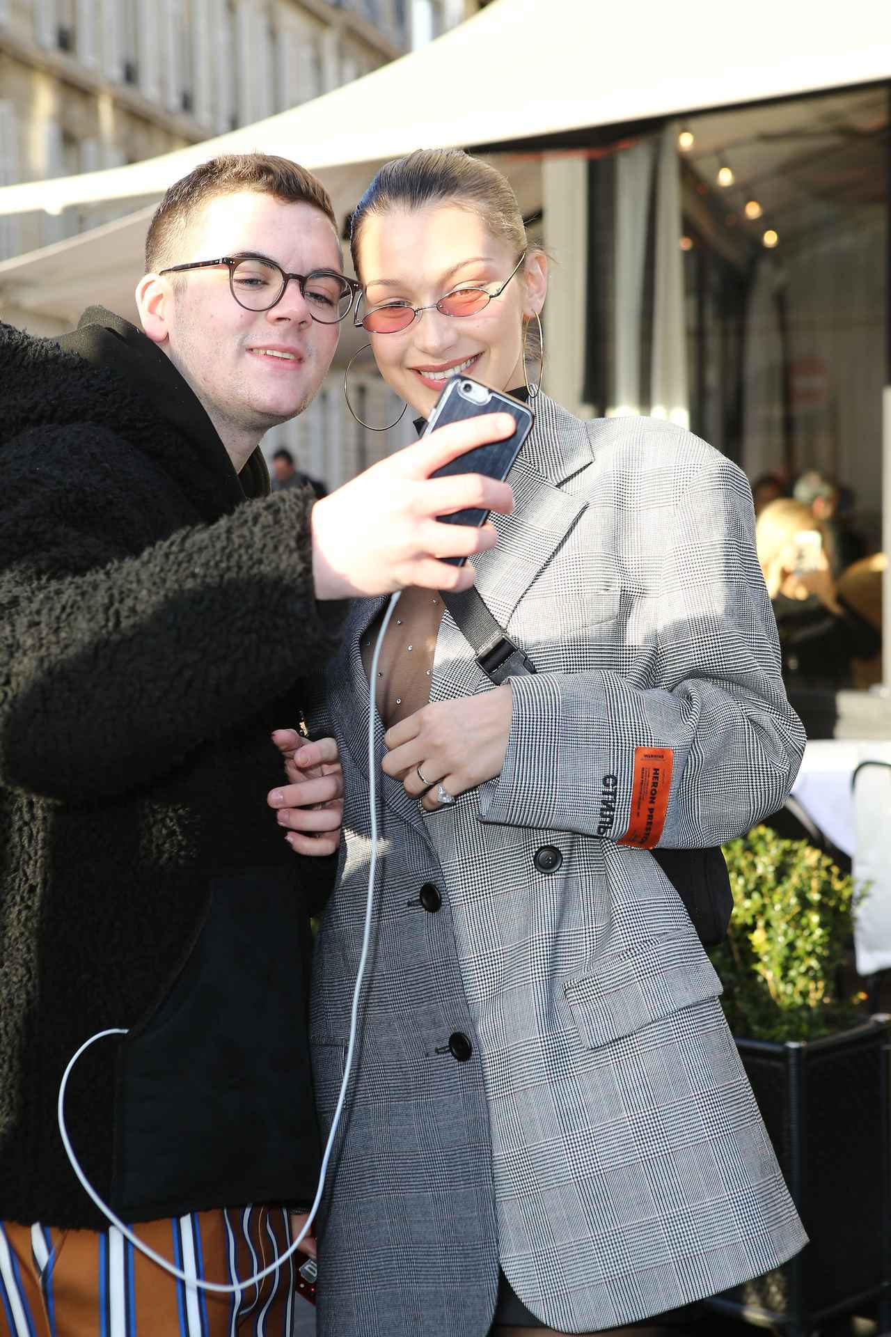 ベラがこの日選んだジャケットは、ALL-WHITEやYeezyなど人気ブランドとも仕事をしてきたデザイナー、ヘロン・プレストンのブランドHERON PRESTONのもの。グレンチェックのジャケットをウエストポーチでしっかりとウエストマークし、インナーには、ビジューが装飾されたシースルートップスでセンシュアルに。