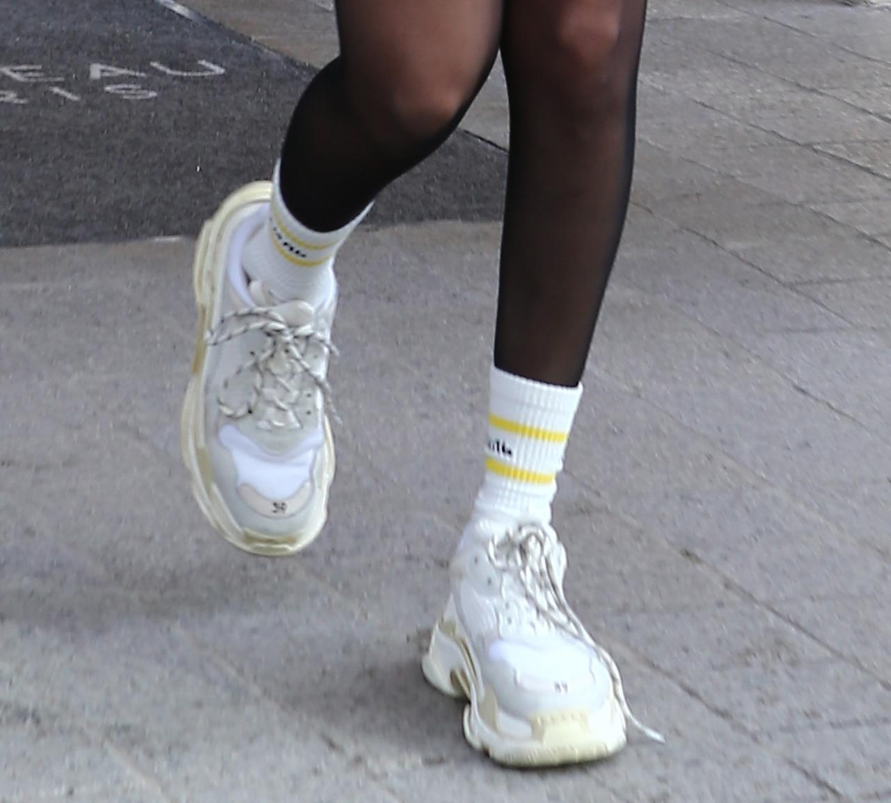さらに個性が光るのが足元。黄色のカラーストライプが入ったソックスに、今続々とセレブが取り入れているダッドシューズで、ちょっぴりアグリーでスポーティに崩して。